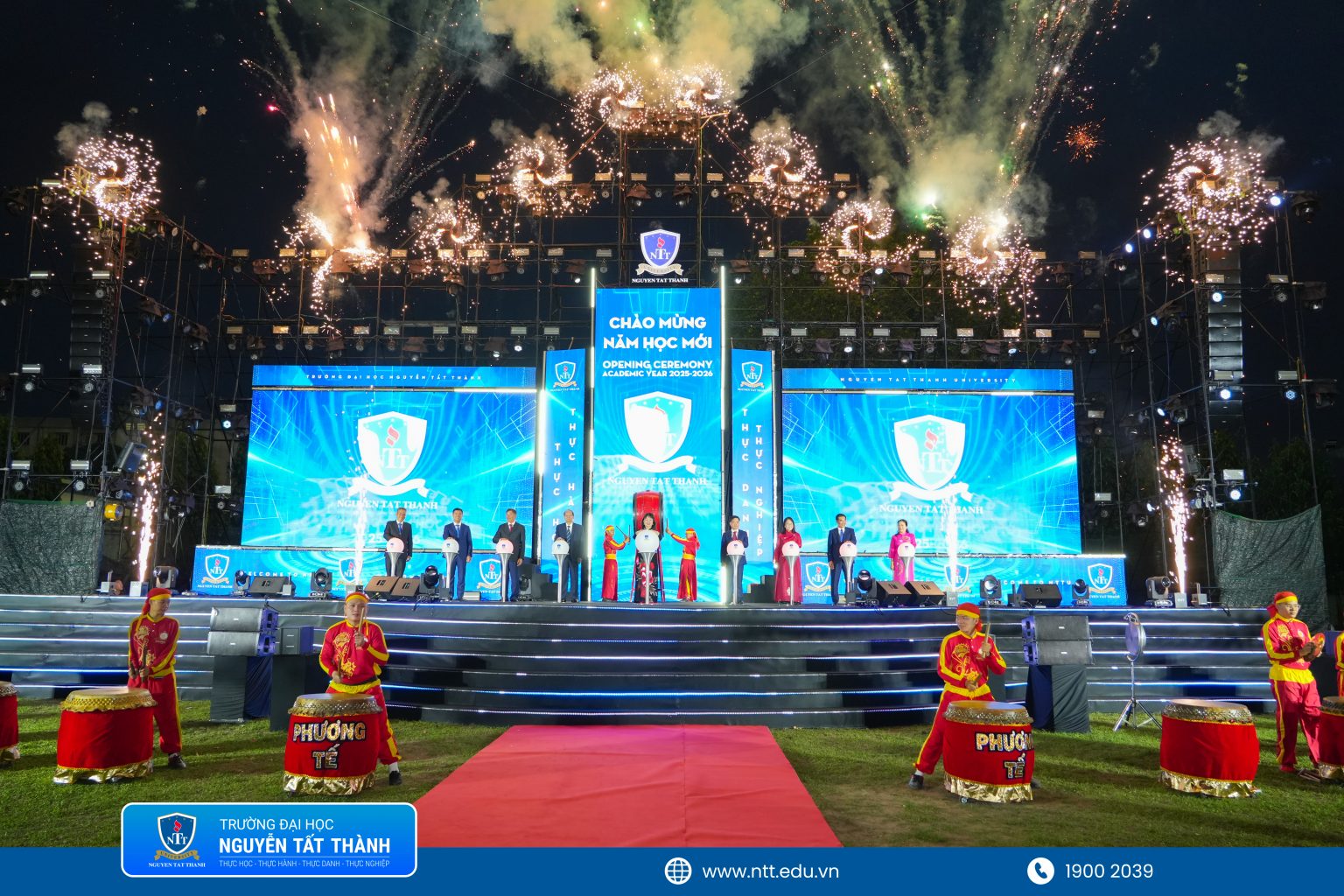 Nghi thức ấn nút khai giảng năm học mới của Ban lãnh đạo NTTU, cùng màn pháo hoa mở đầu đêm gala, chính thức khởi động năm học và chào đón tân sinh viên Trường ĐH Nguyễn Tất Thành