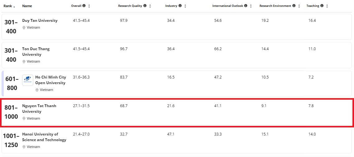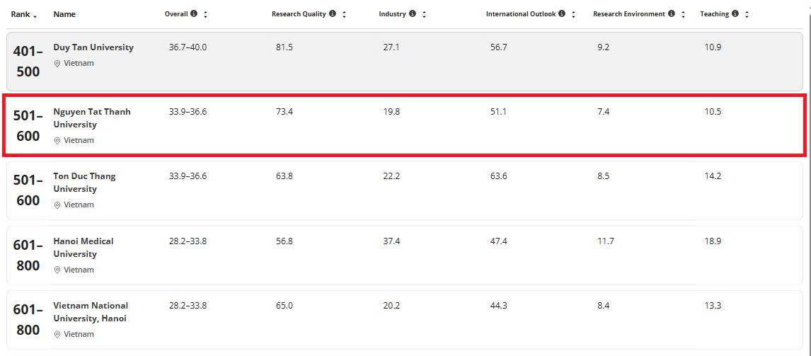 Lĩnh vực Engineering (Kỹ thuật), Trường ĐH Nguyễn Tất Thành được xếp hạng 800-1000 trong tổng số 1555 trường đại học trên toàn cầu và xếp hạng 4 trong số 9 trường đại học tại Việt Nam.